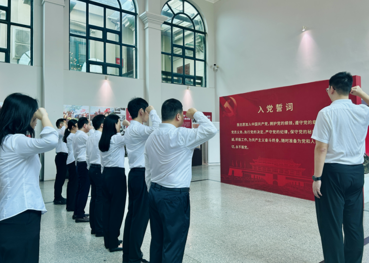 在展馆一层大厅内,全体党员面对入党誓词整齐列队,重温入党誓词,铿锵有力的誓言响彻展厅。随后,《没有共产党就没有新中国》的激昂旋律响起,全体人员齐声高唱,歌声中饱含着对党的无限忠诚与热爱,更传递出赓续红色血脉、践行使命担当的坚定信念。