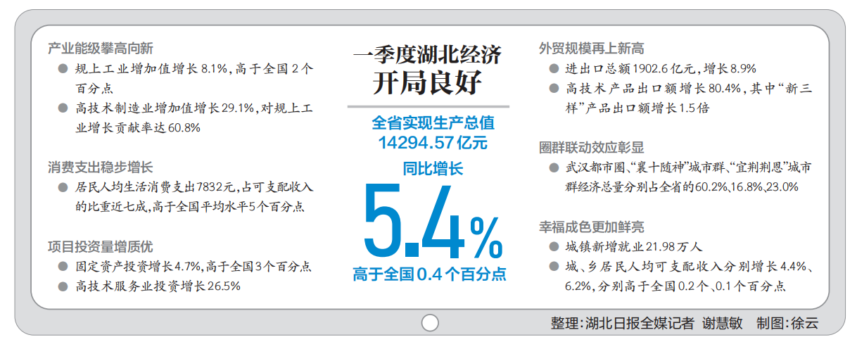 4月20日,湖北省统计局、国家统计局湖北调查总队公布“十五五”首季湖北经济“成绩单”。一季度,全省实现生产总值(GDP)14294.57亿元,按不变价格计算,同比增长5.4%,高于全国0.4个百分点,经济运行稳中提质,实现良好开局。