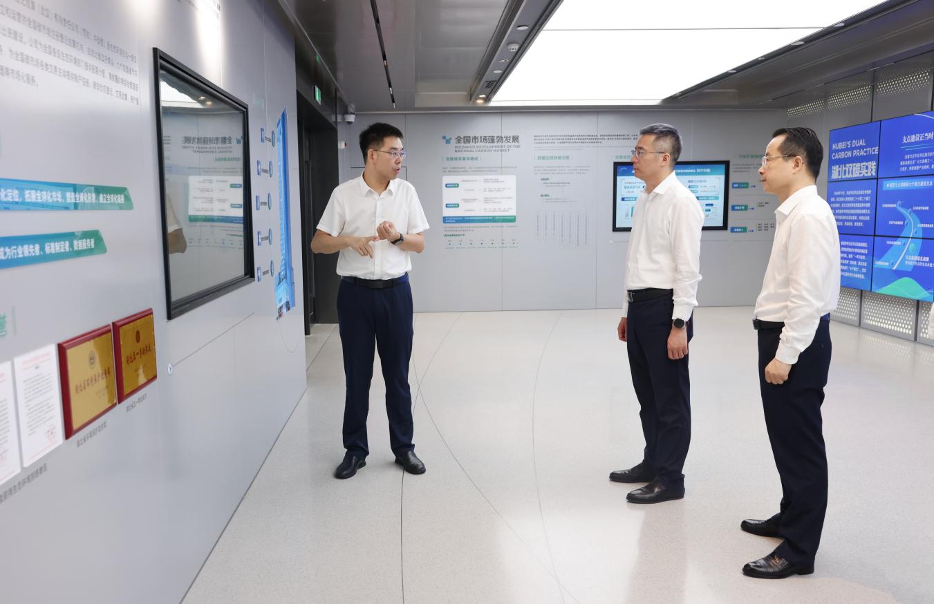 陈忠一行先后来到中碳登公司展厅和业务大厅,详细了解全国碳市场发展历程、中碳登功能定位、业务开展及重点工作进展等方面情况,并与企业相关负责同志深入交流讨论。