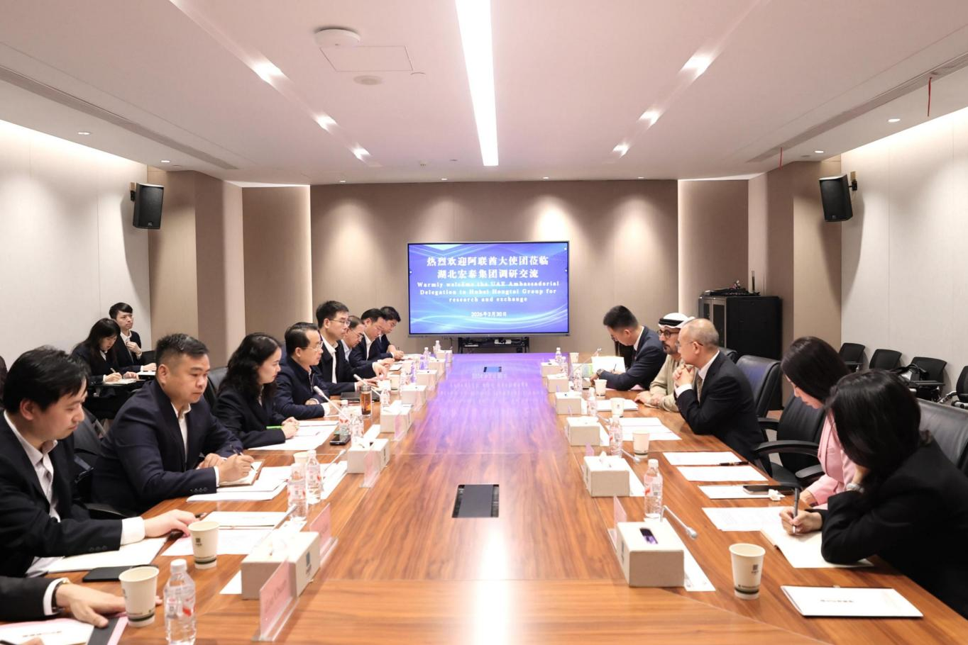 3月30日,阿联酋驻华大使侯赛因·伊卜拉欣·哈马迪一行到访湖北宏泰集团,与集团党委副书记、总经理张世敏就深化中阿金融合作、推动绿色产业发展等座谈交流。湖北省商务厅二级巡视员方家文陪同访问。集团党委委员、副总经理,中碳登党委书记、董事长尹俊参加座谈。