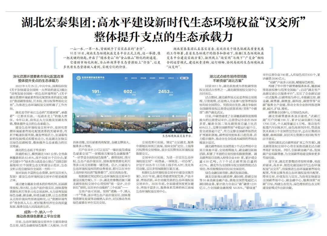 湖北宏泰集团认真落实省委、省政府关于绿色低碳高质量发展的工作部署,在省生态环境厅的指导和推动下,依据《生态环境权益交易平台建设实施方案》,按照线上“淘宝网”与线下“广交会”相结合的运营模式,建设权责清晰、运行顺畅、协同高效的生态环境权益“汉交所”。