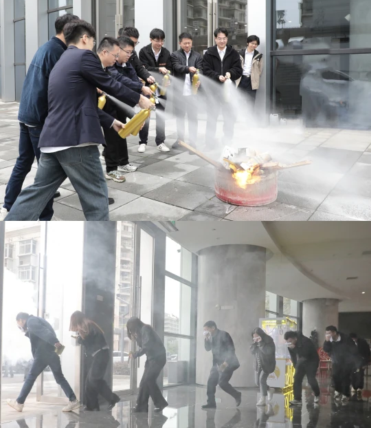 培训会上还开展了消防安全实战演练。随着模拟烟雾弹释放,疏散逃生演习正式启动,全体员工按照逃生规范,用湿毛巾捂住口鼻,弯腰低姿、快速有序地沿着预定路线撤离至安全区域。在灭火实操环节,员工们逐一上前实操演练,熟练掌握灭火要领,锻炼实操能力。演习结束后,消防人员还对公司展厅及办公区域进行了全面消防隐患排查,现场指出潜在风险并提出整改建议。